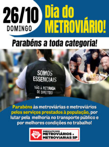 26/10 (DOMINGO)! Dia do Metroviário! Parabéns a toda categoria!