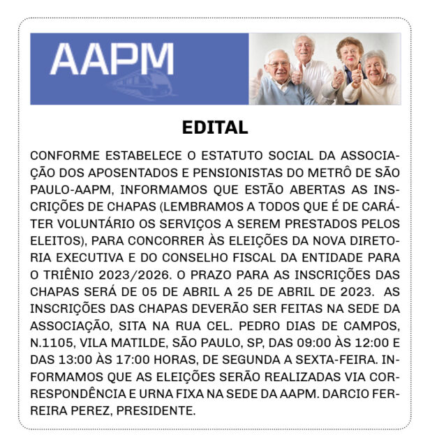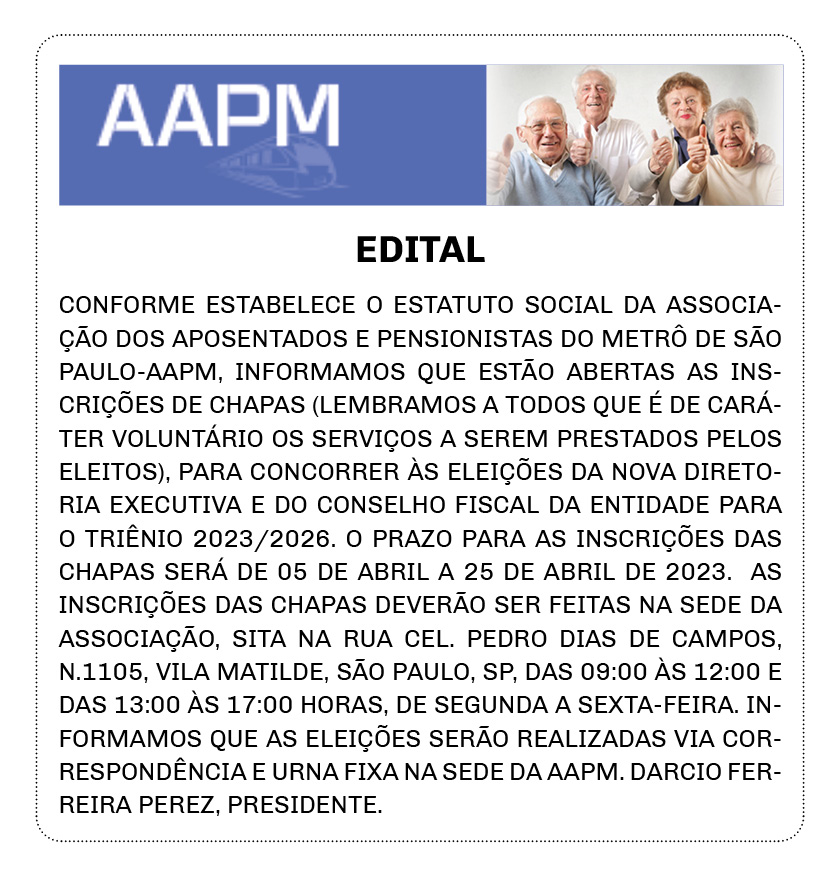 CONFORME ESTABELECE O ESTATUTO SOCIAL DA ASSOCIAÇÃO DOS APOSENTADOS E PENSIONISTAS DO METRÔ DE SÃO PAULO-AAPM, INFORMAMOS QUE ESTÃO ABERTAS AS INSCRIÇÕES DE CHAPAS (LEMBRAMOS A TODOS QUE É DE CARÁTER VOLUNTÁRIO OS SERVIÇOS A SEREM PRESTADOS PELOS ELEITOS), PARA CONCORRER ÀS ELEIÇÕES DA NOVA DIRETORIA EXECUTIVA E DO CONSELHO FISCAL DA ENTIDADE PARA O TRIÊNIO 2023/2026. O PRAZO PARA AS INSCRIÇÕES DAS CHAPAS SERÁ DE 05 DE ABRIL A 25 DE ABRIL DE 2023. AS INSCRIÇÕES DAS CHAPAS DEVERÃO SER FEITAS NA SEDE DA ASSOCIAÇÃO, SITA NA RUA CEL. PEDRO DIAS DE CAMPOS, N.1105, VILA MATILDE, SÃO PAULO, SP, DAS 09:00 ÀS 12:00 E DAS 13:00 ÀS 17:00 HORAS, DE SEGUNDA A SEXTA-FEIRA. INFORMAMOS QUE AS ELEIÇÕES SERÃO REALIZADAS VIA CORRESPONDÊNCIA E URNA FIXA NA SEDE DA AAPM. DARCIO FERREIRA PEREZ, PRESIDENTE.