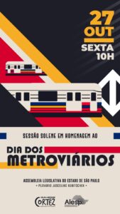 A Assembleia Legislativa de São Paulo (ALESP) fará uma SESSÃO SOLENE no dia 27/10 (sexta-feira), no Plenário JUSCELINO KUBITSCHEK, às 10h da manhã, em HOMENAGEM AO DIA NACIONAL DA CATEGORIA METROVIÁRIA. Será mais uma data de RESISTÊNCIA E DE LUTA DA CATEGORIA METROVIÁRIA e CONTRA AS ARBITRÁRIAS DEMISSÕES promovidas pelo Governo Tarcísio e o Metrô de São Paulo. O Sindicato convida a categoria a participar bem como entidades sindicais e populares