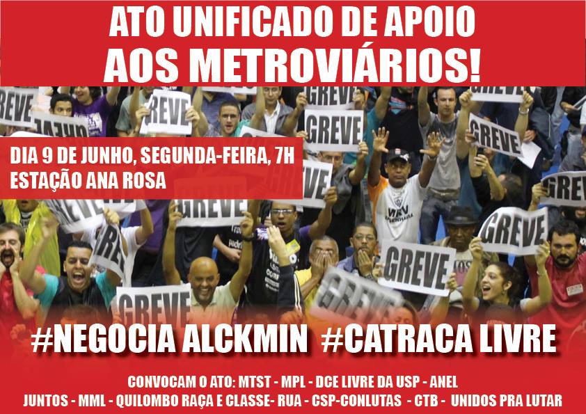 Ato de apoio aos metroviários na 2ª feira (9/6), 7h, na estação Ana Rosa
