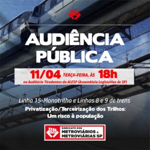 Na terça-feira (11/4), a partir das 18h, no auditório Tiradentes da Assembleia Legislativa de SP, será realizada a Audiência Pública Linha 15-Monotrilho e Linhas 8 e 9 de trens — Privatização/Terceirização dos Trilhos: Um risco à população.