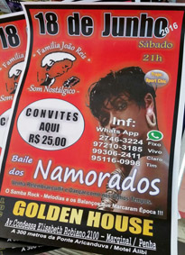 baile_namorados3O tradicional Baile dos Namorados promovido pela família João Reis, será neste próximo  sábado, dia 18/6,  a partir das 21h, no Salão Golden House, antigo Big House, na av. Cond. Elisabete Robiano, 2100, Penha, Marginal, a 300 metros da Ponte Aricanduva, ao lado do motel Álibi. Estacionamento no local.Traje: Sport Chic. Informações, fones: 2746-3224/9306-2411 (Claro)/7210-3185 (Vivo). Realização: família João Reis. Convites: R$ 25,00. Metroviários tem desconto de 50% ao apresentar o crachá na portaria (desconto dá direito ao desconto para no máximo dois convites). Convites antecipados: R$ 15,00.