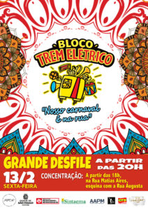 Prepare-se para o Carnaval 2026: participe do grande desfile do Bloco do Trem Elétrico vai acontecer na sexta-feira (13/2), a partir das 18h. A concentração acontecerá na esquina da Rua Augusta com a Matias Aires com desfile a partir das 20 horas. O lema do bloco continua a ser “Nosso carnaval é na rua”.