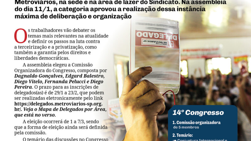 LinhaUni Metrô Notícias Slider Últimas Notícias ViaMobilidade ViaQuatro 14⁰ Congresso da categoria: conheça a programação, as delegadas e delegados e os critérios para as teses metroviarios 7 de março de 2024
