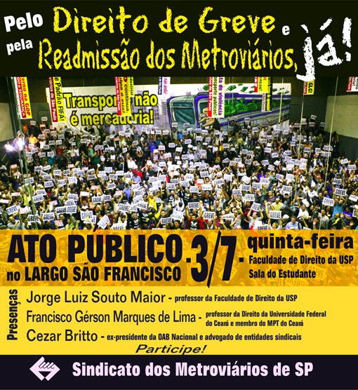 - Será realizado um ato em solidariedade aos 42 demitidos. O Ato pelo Direito de Greve e pela Readmissão dos Metroviários, já!