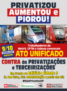 Em assembleia no dia 5/10, a categoria decidiu por NÃO REALIZAR A GREVE na semana que vem. A luta contra os pregões de terceirizações do atendimento nas estações e manutenção dos trens na linha 15 continua: a assembleia aprovou uma grande manifestação em frente ao Cidade 2 no dia 9/10.