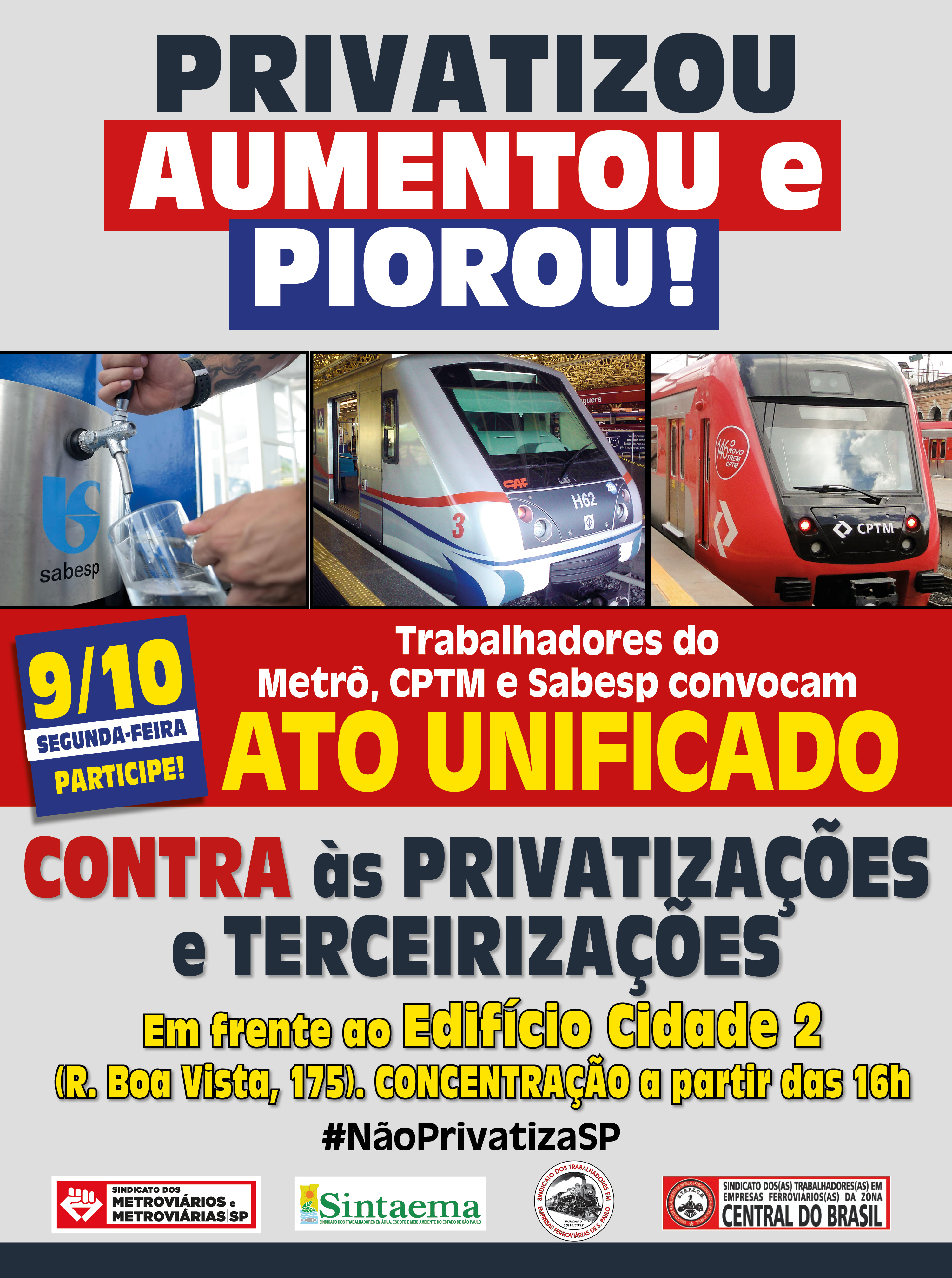ATO UNIFICADO: Dia 9/10 (segunda-feira), concentração a partir das 16h, em frente aO Edifício Cidade 2 ((R. Boa Vista, 175). PARTICIPE!