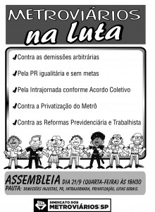 Assembleia dia 21/9, quarta-feira, às 18h30 no Sindicato