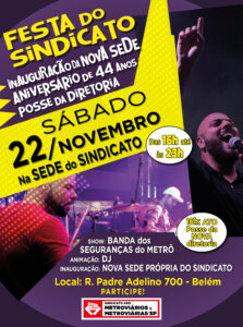 No próximo dia 22/11, a partir das 16h, ocorre a festa do Sindicato dos Metroviários e Metroviárias SP.