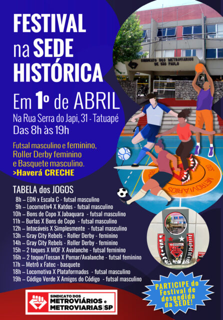 No sábado (1º/4), das 8h às 19h, haverá o Festival da Sede Histórica, com jogos de futsal masculino e feminino, roller derby (feminino) e basquete (masculino). Haverá creche. Endereço: rua Serra de Japi, 31 – Tatuapé. PARTICIPE do Festival de despedida da SEDE! HAVERÁ CRECHE!