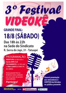 A final do 3º Festival Metroviário de Viodeokê acontecerá no próximo sábado, 18/8, a partir das 18h na sede do Sindicato dos Metroviários de SP. A terceira edição do festival contou com grande participação da categoria, envolvendo trabalhadores de todas as áreas e setores da empresa.