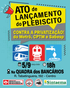 Nosso objetivo é que o plebiscito seja parte de uma grande campanha, com o objetivo de fazer com que o governador recue de sua política privatista. Ele quer entregar o Metrô, a CPTM e a Sabesp. O ato no dia 5/9 será o ponto de partida dessa luta.