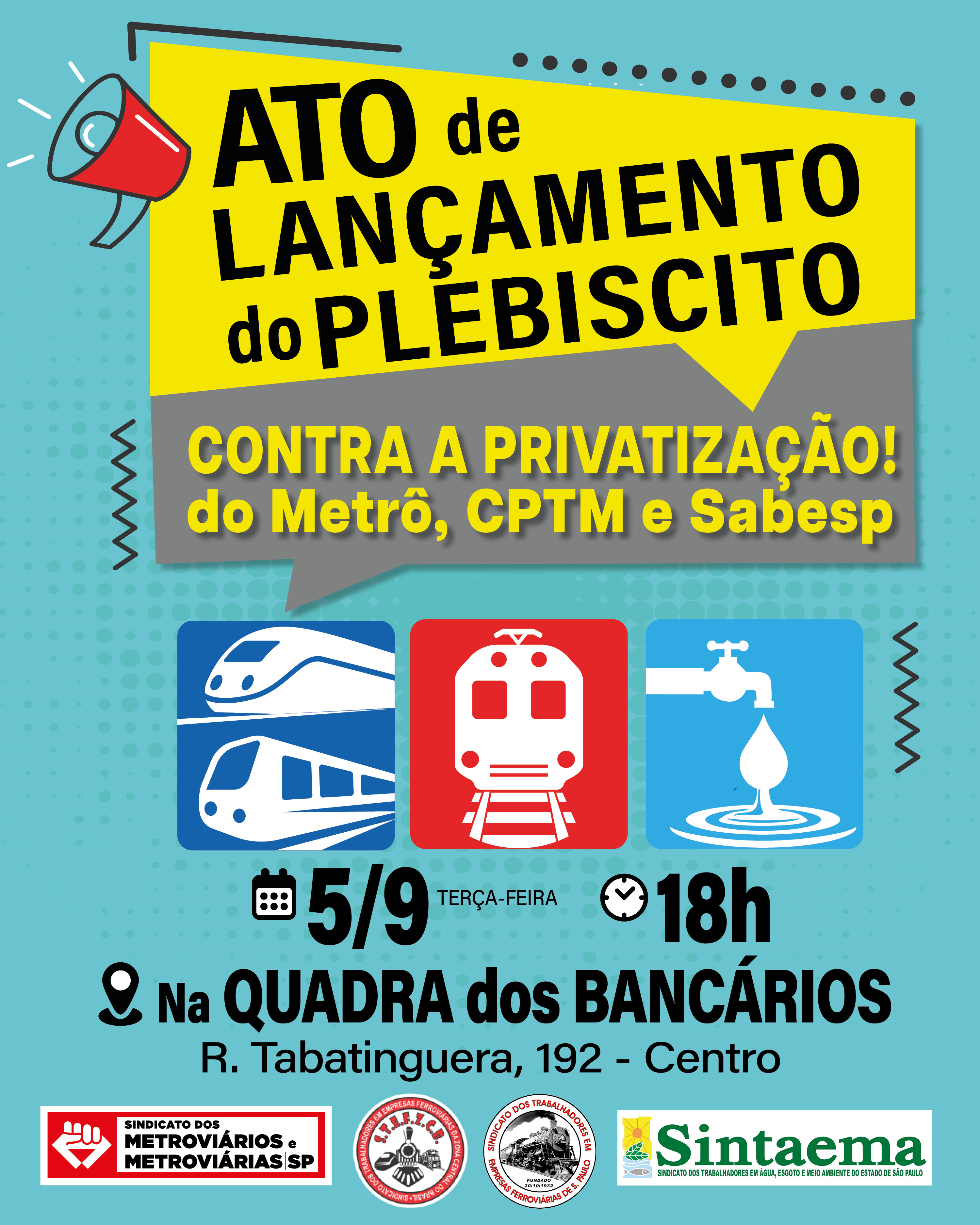 - O ato de lançamento do plebiscito acontecerá em 5/9, às 18h, na Quadra dos Bancários (rua Tabatinguera, 192 – Centro).