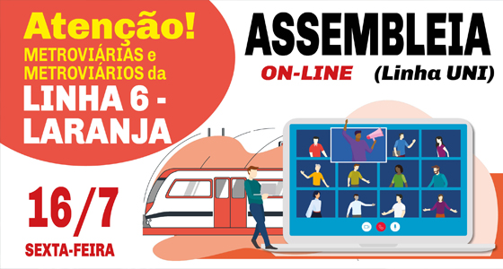 Metroviário da L-6: vote na assembleia de 16/7 15 de julho de 2021 Notícias, Sem categoria, Últimas Notícias Atenção, metroviário da Linha 6-Laranja (UNI): participe da assembleia! Assembleia on-line na sexta-feira (16/7), das 13h às 19h. Pauta: aprovação do Acordo Coletivo. Acesse: https://assembleia.metroviarios-sp.org.br/linhauni/ assembleia Linha Laranja