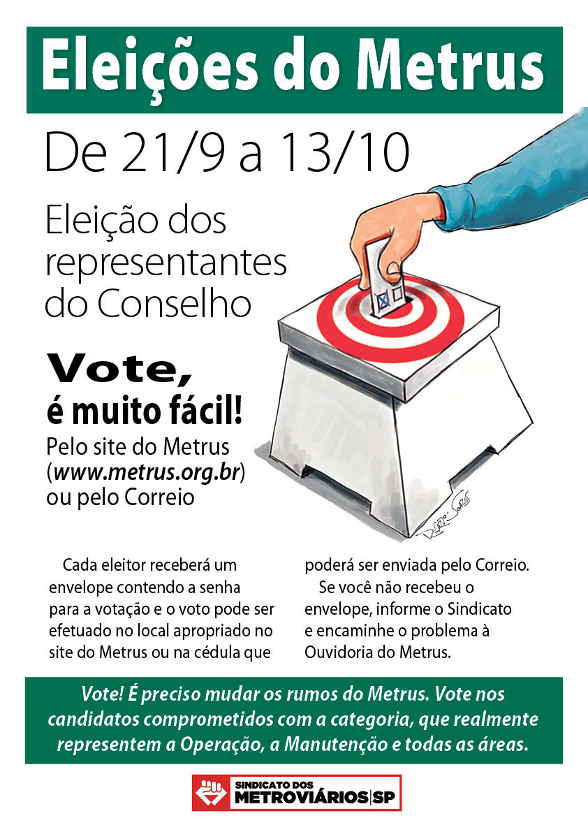 Como votar: você receberá um envelope contendo a senha para a votação pela Internet no site do Metrus e também o material para votar pelo correio, se assim desejar. Se você não recebeu o envelope, informe o Sindicato e encaminhe o problema à Ouvidoria do Metrus.