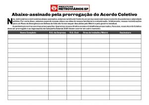 Está circulando entre os metroviários, de forma digital aqui e também física, um abaixo-assinado reivindicando a prorrogação do nosso Acordo Coletivo com a manutenção dos direitos. Participe!