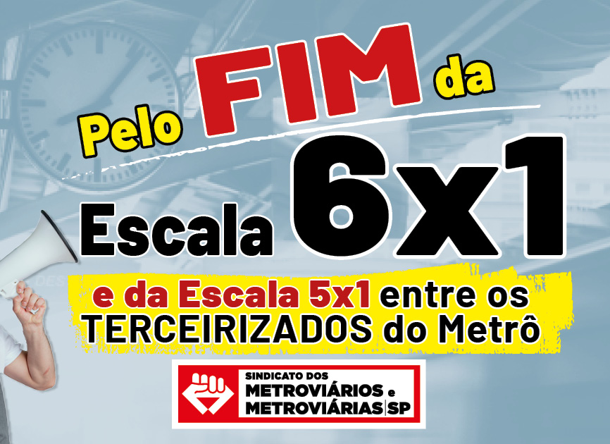 A categoria metroviária e o Sindicato somam-se à luta nacional pelo FIM DA ESCALA 6×1 e trazem essa batalha para dentro do Metrô. Lutando pelo FIM DA ESCALA 5×1 entre os terceirizados, pois essa escala é igualmente injusta no sentido de impedir os trabalhadores de terem vida além do trabalho. Está sendo coletado assinaturas por meio de um abaixo assinado na categoria metroviária, que também fará uso de um adesivo contra as escalas 6×1 e 5×1 entre os terceirizados da Cia.