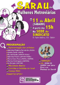 O Sindicato realizará em 11 de abril o SARAU das Mulheres Metroviárias. Será um evento de cultura e confraternização que fechará o período das atividades das mulheres na categoria.