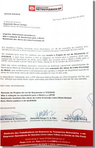 Sindicato protocola emenda ao PL do Orçamento: mais recursos para o Metrô