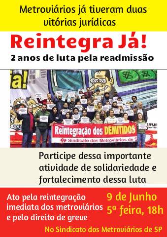 No dia 9 de junho, completam-se 2 anos do fim de uma das greves mais poderosas que a categoria metroviária de São Paulo fez e também 2 anos da demissão de 42 companheiros, como retaliação à greve. De lá para cá, conquistamos a reintegração de 5 colegas e estamos na batalha pelo retorno de todos.