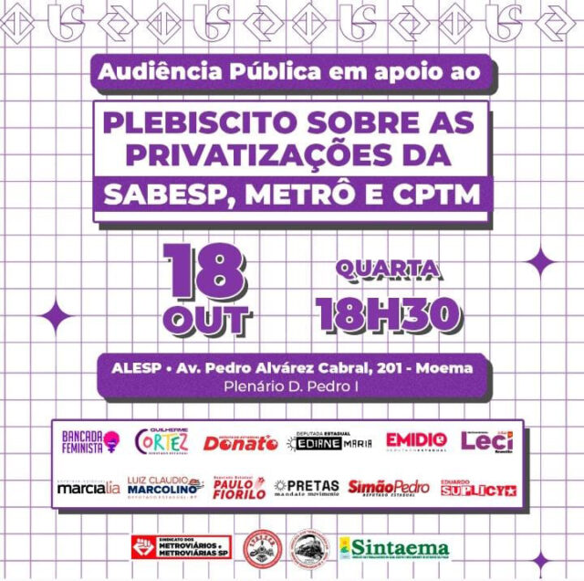ALESP promoverá AUDIÊNCIA PÚBLICA, dia 18/10, em apoio ao PLEBISCITO Privatizações da Sabesp, Metrô e CPTM