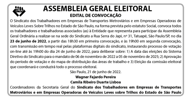 A assembleia de 23/6 deflagará o processo eleitoral do Sindicato para o mandato de 6/11/2022 a 5/11/2025. Nela será definida a data das eleições, em que período serão realizadas e o mapa de distribuição das áreas de trabalho. Também na assembleia será eleita a Comissão Eleitoral que coordenará todo o processo.