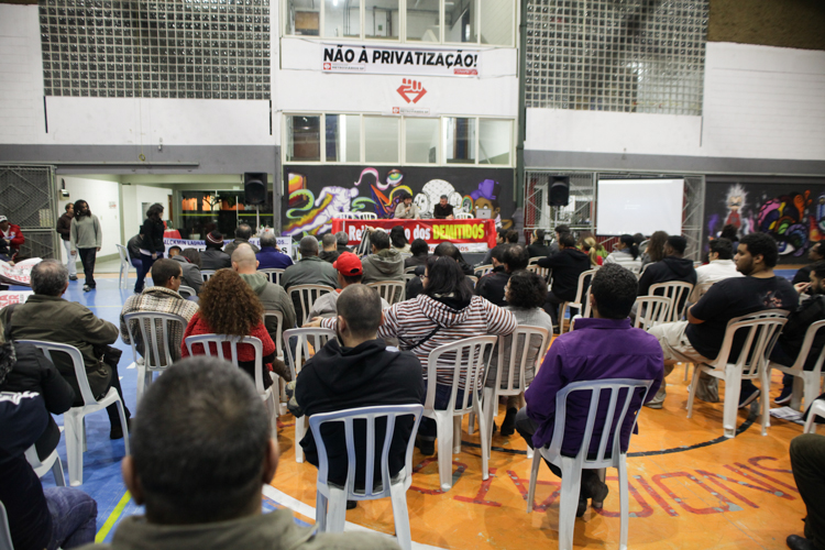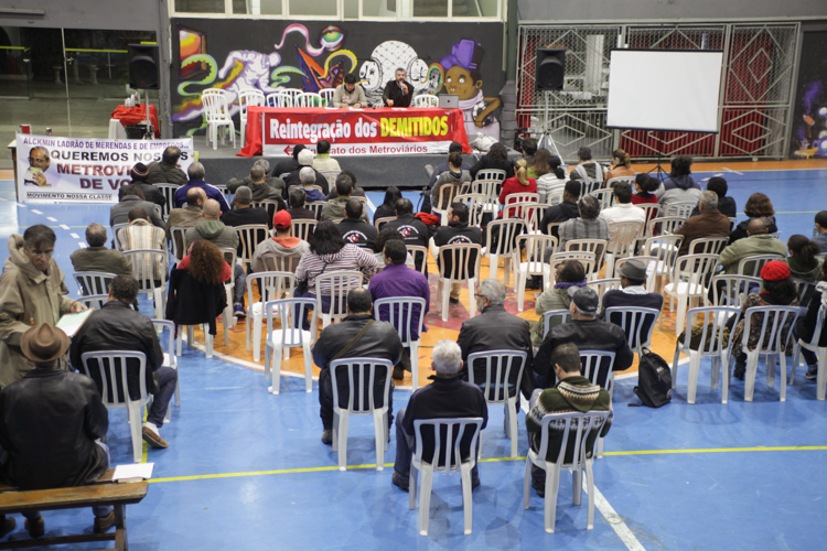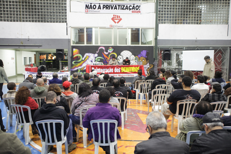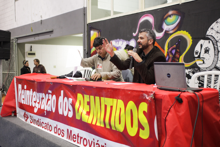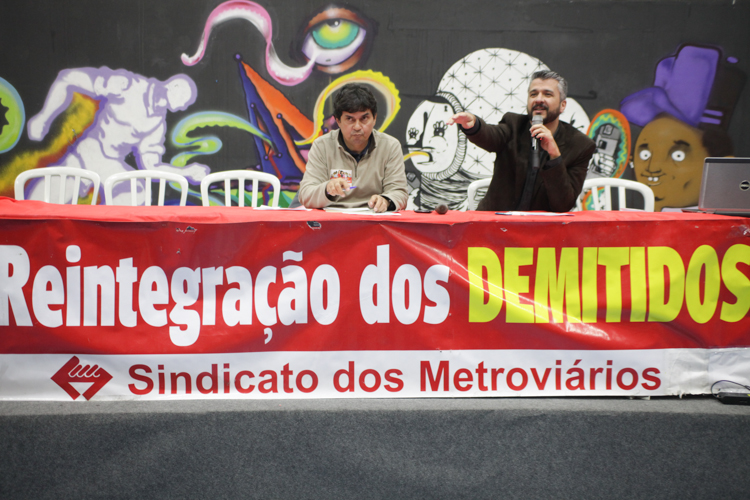 Ato pela reintegração dos metroviários 10 de junho de 2016 Fotos, Imagem em Destaque, Multimídia No dia 9 de junho completaram-se 2 anos que os trabalhadores do metrô foram demitidos após uma greve histórica da categoria. Lembramos essa data e a luta pela reintegração dos companheiros com um ato que aconteceu no Sindicato. Filhos da greve Demitidos por fazerem greve em 2007 campanha de reintegração dos metroviárioscampanha pela reintegraçãoreintegraja