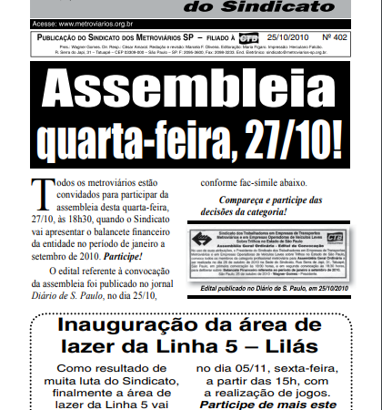 Últimas Notícias Assembleia extraordinária, quinta-feira, dia 27/01, às 18h30. Pauta: VR, VA, cheque-supermercado metroviarios 24 de janeiro de 2011