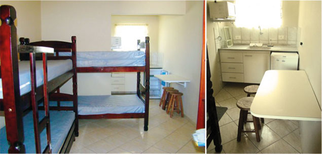 Cada apartamento com acomodações para até cinco pessoas. Mobiliados com beliches, armário para roupas, travesseiros, frigobar, microondas, ventilador de teto e ponto para antena.