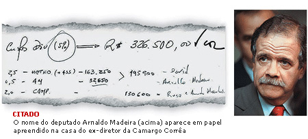 Em 2006, Arnaldo Madeira elegeu-se deputado federal e não registrou oficialmente nenhuma doação vinda da Camargo Corrêa ou de suas empresas para sua campanha eleitoral. Madeira negou ter recebido dinheiro ou doações de campanha da empreiteira. “Eu nem conheço o diretor financeiro da Camargo Corrêa, nem sei quem é. Não tenho nenhuma relação com os sócios da empreiteira, o que pode ser até falha minha. Pode ser até que eu conheça de algum evento social, mas não sou capaz de identificar um diretor da empreiteira.” Como chefe da Casa Civil do governo Alckmin, Madeira era o responsável por checar se as obras do Metrô e do Rodoanel estavam no prazo previsto. Madeira diz não ter ideia de como seu nome foi parar nas anotações do diretor da Camargo Corrêa e disse que não foi comunicado oficialmente sobre nenhuma investigação a esse respeito.