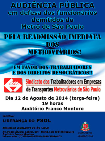 Na próxima terça-feira (12/8), às 19h, na Assembleia Legislativa, vai acontecer uma Audiência Pública em defesa dos metroviários demitidos. A audiência será realizada no Auditório Franco Montoro.