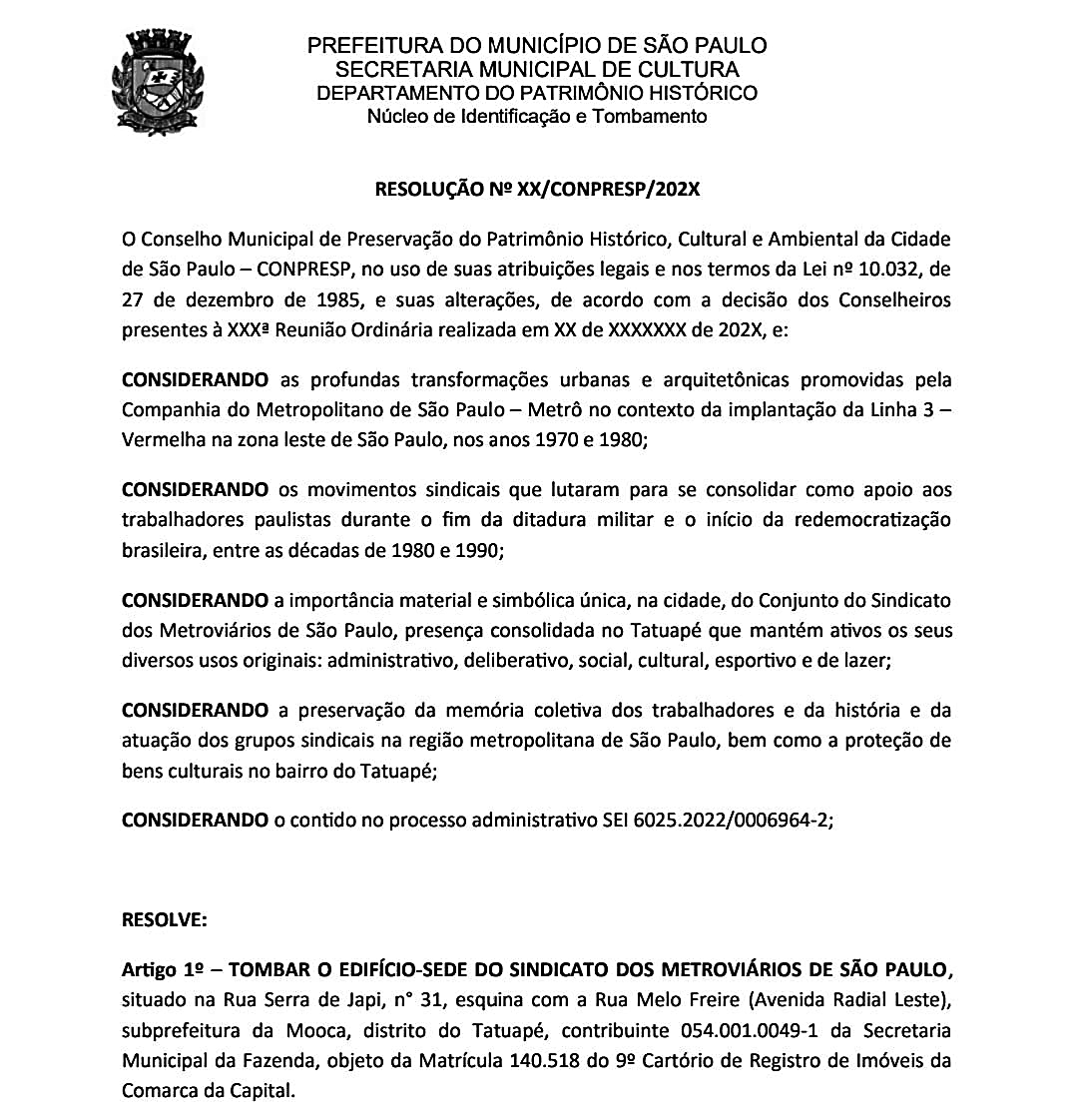 Após a instauração do processo de tombamento do imóvel, pedido pelo Ministério Público, a Construtora Porte encerrou o diálogo com o Sindicato e entrou com o pedido de liminar. O Sindicato já entrou com recurso pedindo a nulidade do pagamento dos aluguéis, porque além dessa cobrança ser injusta, o Sindicato não tem condições financeiras para arcar com esse valor. Mas, até o julgamento, que provavelmente vai ocorrer no começo de 2023, os valores são devidos pelo Sindicato.