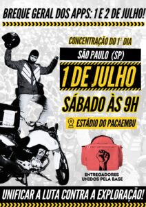 Motoboys que utilizam os aplicativos de entrega estão se organizando para uma paralisação nos dias 1º e 2/7. Haverá uma concentração, no dia 1º/7 (sábado) a partir das 9h, no Estádio do Pacaembu. O objetivo da mobilização é unificar a luta contra a exploração.