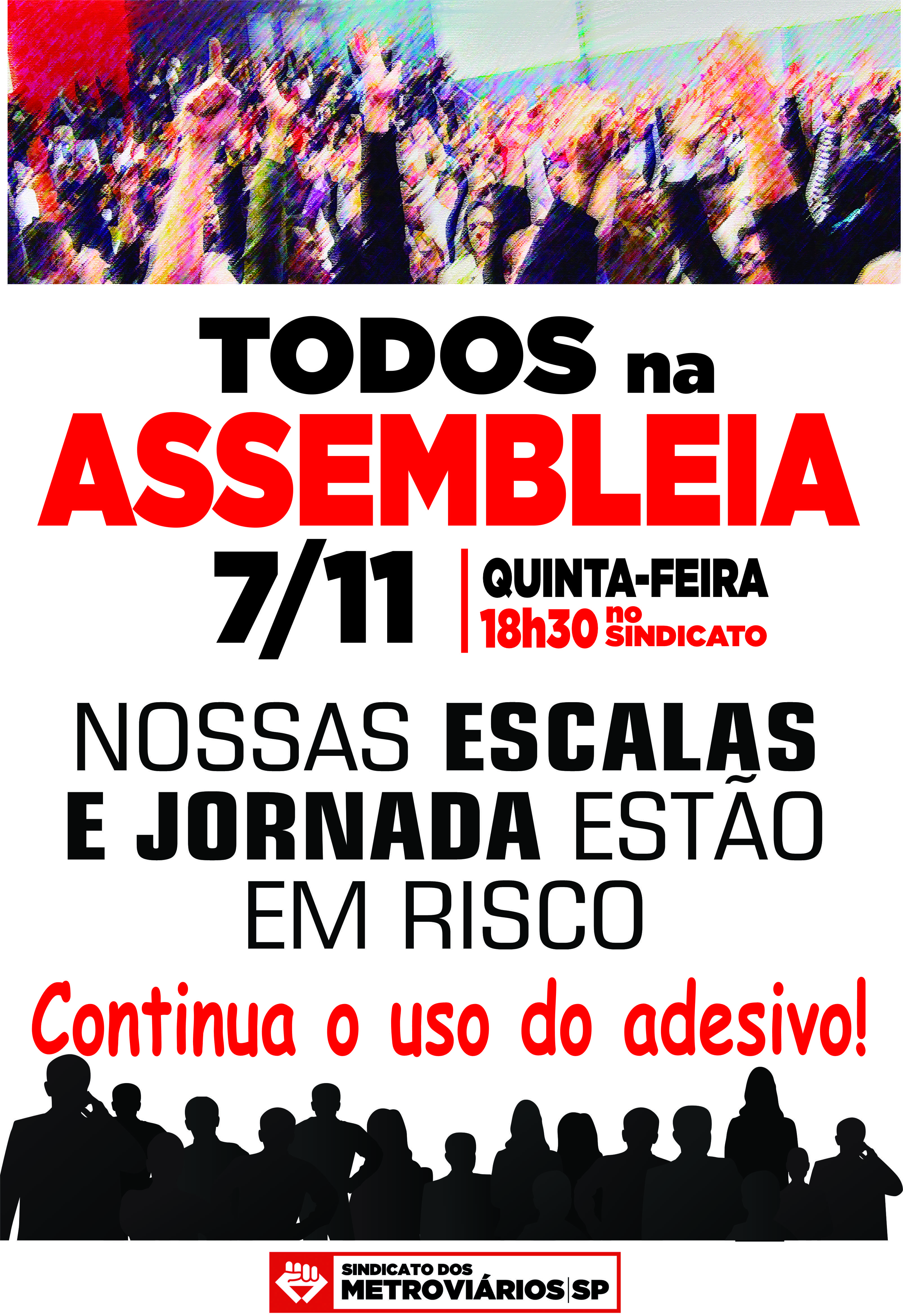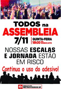 Use uso do adesivo nas áreas. Participe da assembleia nesta quinta-feira, 7/11, às 18h30 no Sindicato.